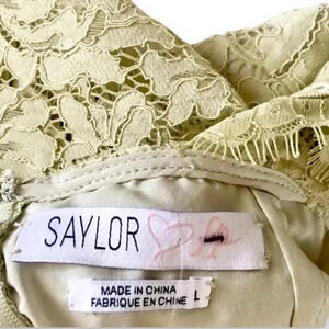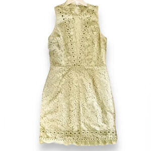 Delicate floral lace bodycon dress in a mini length. High neck with an unlined plunging neckline. Scalloped eyelash lace trim. Exposed back. Hidden back zipper. Fully lined.