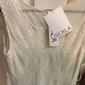 Never been worn sequined cocktail hour ivory sleeveless dress shirt. Very intricate detail with sheer neckline. Attached snaps to secure your bra so they don’t slip down and show. Has attached loops to secure on hanger. Brand is Scala