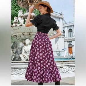 Features: This long skirt for women is completed with decorative buttons down the front, an elasticated back waist, designed with a high waist, a flared hem with ruffles that hits the ankle