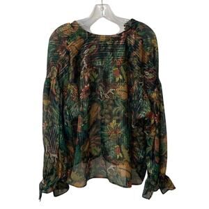 Scotch & Soda Maison Scotch women’s XS new with tags sheer long sleeve blouse in multicolor floral print. Lightweight and flowy with button front and subtle metallic thread detail. Slightly puffed sleeves with elastic cuffs and relaxed hem—perfect for layering over a cami, bralette, or lace tank. Pair with wide-leg trousers, vegan leather pants, or a midi skirt and boots for fall. Ideal for transitional weather, late summer nights, or early autumn layering.