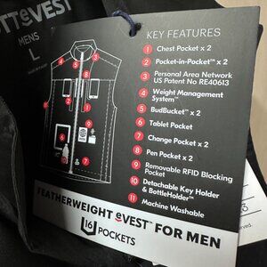 NWT Scottevest Mens Featherweight eVest Black Vest L 16 Pockets RFID BottleHolde