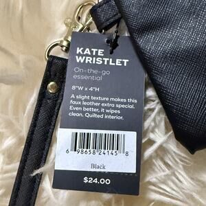 The NWT Scout Bags Kate Wristlet in Black Faux Leather offers a stylish and compact accessory for women. With a quilted stripe interior, zip closure, and gold hardware accents, this mini wristlet exudes a minimalist, preppy, athletic hipster and functional vibe. Measuring 8” in width and 4” in height, this versatile bag can be worn on the wrist and is perfect for carrying essentials while on the go. The black exterior and black and white striped lining add a touch of sophistication to this trendy accessory.