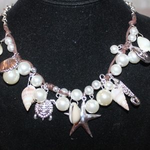 NWT Sea Life Chain Necklace, 18" Silver Plated Chain, Charms on round leather Necklace, Starfish, Turtle, Seahorse, Sandollars, small & large white Pearl's, Shell of different kinds. Lobster Clasp
