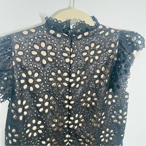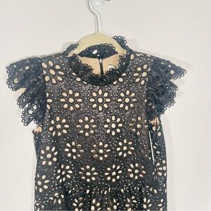 Color & Detail: Black, sequin eyelet fabric, ruffled neckline, flutter sleeves, concealed back zip