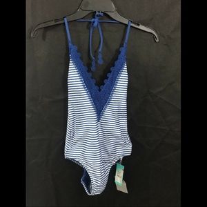 Delicate scalloped lace traces the plunging V-neck of this halter-one piece that's sporty and sweet in classic stripes.