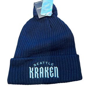 NWT Seattle Kraken Fanatics Wordmark Logo Navy Cuffed Knit Pom Beanie Hat