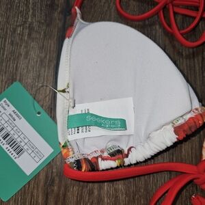 The product is a stylish NWT Seekers Australia rose print halter neck two-piece bikini swimsuit in size 8. The swimsuit features a floral pattern in white and red, with a triangle top and bikini bottom style. Made in Australia, it is lightweight, padded, and has an adjustable strap for a comfortable fit. Perfect for beach, flower, and Australia-themed vacations or resorts, this bikini exudes a sexy and resort-like vibe. Suitable for machine washing and designed for regular sizing, this bikini is a fashionable choice for women's swimwear.