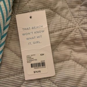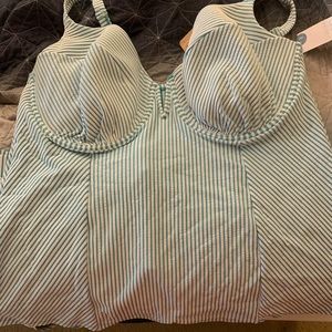 Beautiful white and teal blue seersucker bathing suit top from Cacique/Lane Bryant! Features a V shape in the front of the wire. There is and inside hook and eye closure so it supports like a Cacique bra does. The straps are adjustable.