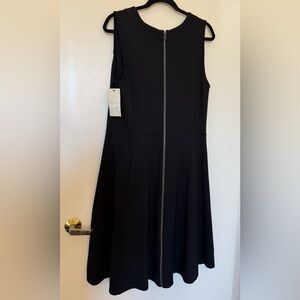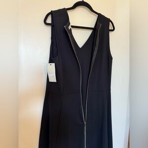 NWT Sejour black sleeveless dress. V-neck. Gold zipper that runs the length of the back and unzips about halfway. Beautiful heavy material so the dress lays and moves beautifully. Sophisticated elegance.