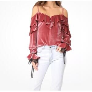 NWT Self Portrait Pink Off Shoulder Long Suede Sleeve Black Lace Fringe Top Sz 2