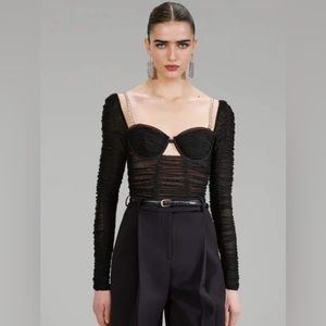 This ruched mesh top from London-based label Self-Portrait features a bustier bodice with a center cut out. Wide-set long sleeves with sparkling crystal straps complete this fitted style.