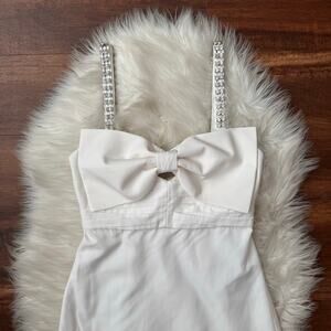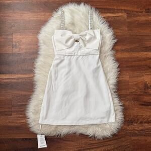 Cut from white taffeta this mini dress is designed with detachable diamanté straps and bow detail at the bodice. This style is lined with pockets.