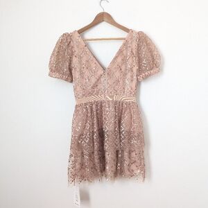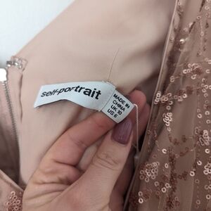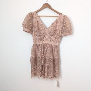 NWT Self-Portrait Blush Nude Taupe Rose Gold Sequin Grid Tiered Mini Dress