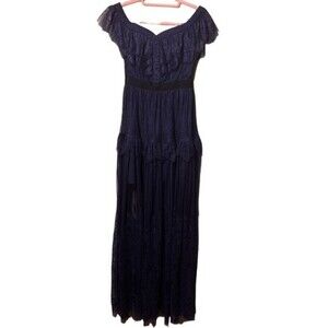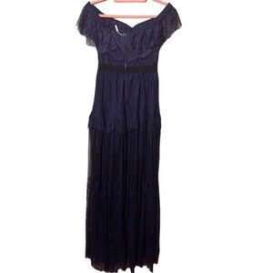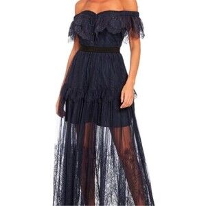 NWT Self-Portrait Navy Blue Off Shoulder Fine Lace Maxi Dress