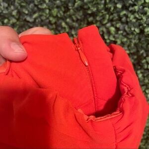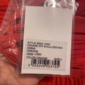 This style is cut from Orange pleated chiffon. The midi dress is designed with a subtle off shoulder silhouette that is slim fitting through the bodice and falls to a flared midi skirt. This style is lined.