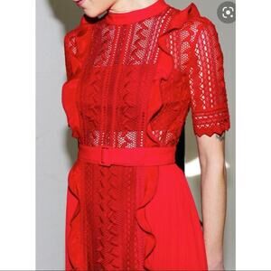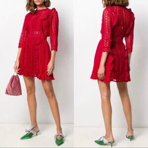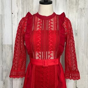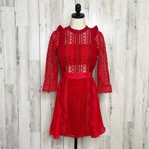 NWT Self-Portrait Red Geometric Lace Dress Guipure Crochet Preppy Twee Size 2
