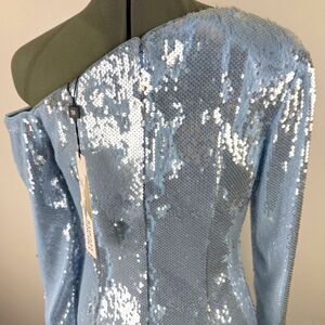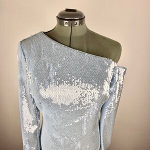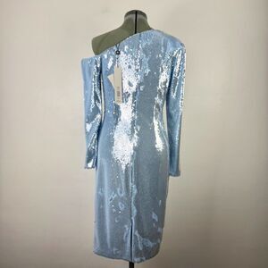 Stunning sequin bodycon cocktail dress by Badgley Mischka featuring a one-shoulder neckline, fitted silhouette, and shimmering ice blue sequins throughout. Perfect for NYE, holiday parties, bachelorette events, or any formal night out. Brand new with tags, originally $495.