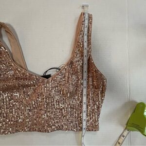 Shine bright with this stunning sequin embellished crop top. Perfect for a night out, this gold top adds a touch of glamour to any outfit. NWT fully lined very comfortable top not stiff at all. It is stretchy