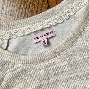 New With Tags Sequin Hearts by My Michelle Co. Crop Waffle Textured w Tiered Bell Sleeves. Medium. Very Pretty Beige & Off-White Marled Coloring. Simple, yet perfectly placed subtle lace strip around top of arm. Boho. Excellent quality, boutique style top. Polyester/cotton. So unique & pretty. Approximate measurements while laying flat: 20" pit to pit, 21" length. 24" sleeve length.
