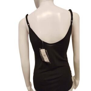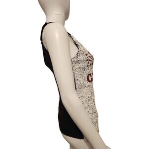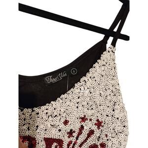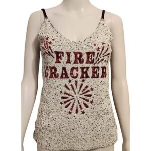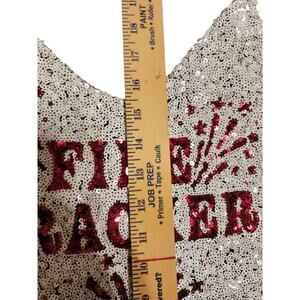 White and Red sequins top with adjustable spaghetti straps. Reads 'Fire Cracker'. Back of the top is black.