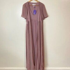 Elegant mauve maxi dress by Seraphine. Features a flowing design with short sleeves. Perfect for special occasions.
