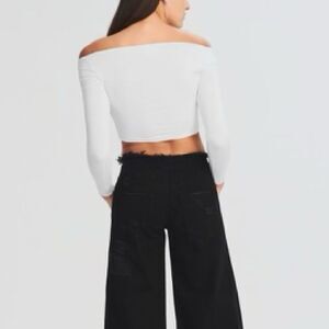 Soft jersey long-sleeve crop top. Peekaboo cut out with twist detail at chest.