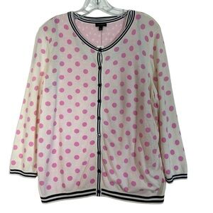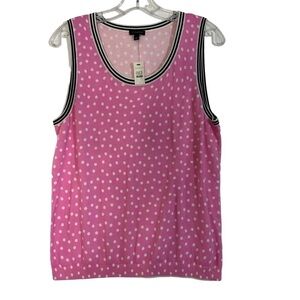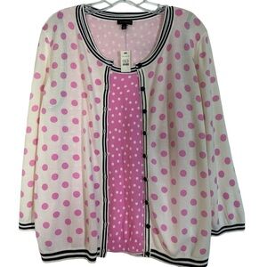 Beautiful soft knit matching cardigan and tank set in preppy polka dots. Contrast tipping at neck and arm openings on tank, at neck, button placket and hem on cardigan. NWT Full-button cardigan with 3/4 sleeves. 20.5” pit to pit, 26” length on tank. 21” pit to pit on cardigan.