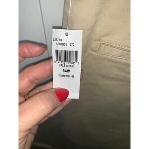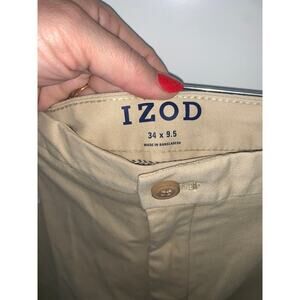 Keywords: IZOD, men's chinos, size 34, beige pants, stretch fabric, casual wear, summer fashion, solid pattern, flat front, button closure, machine washable, regular fit, slash pocket, new with tags, men's casual shorts