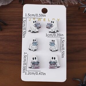 NWT! Set of 3 Pairs of Pierced Post Earrings! Ghosts Holding Multicolored Books!