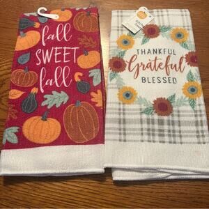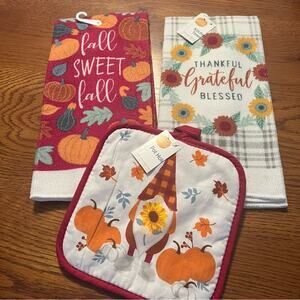 NWT Set of 3 Pieces Kitchen Dish Towels & Pot Holder. Fall Gnome Pumpkins Sunflowers Gourds Autumn. New with tags. Fall Sweet Fall. Thankful Grateful Blessed. Thanksgiving. Please see close-up pictures for details & measurements. Hand towels. 2 microfiber towels & one square pot holder.