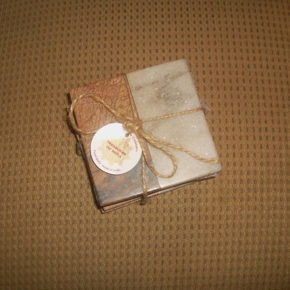This is a set of 4 marble coasters that are multi color by Treasures of India brand. These have never been used. The weight of these is relatively heavy. They are solid and should be long lasting.