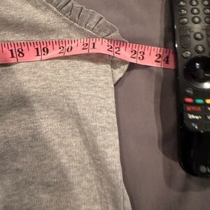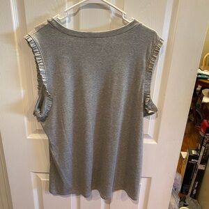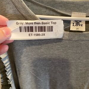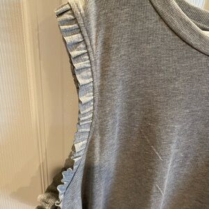 I am selling a new with tag ribbed ruffle tank from Sew In Love. The tank has ruffle sleeves and the tank itself is ribbed. The color is grey and the size is 2X. The material content is 63% polyester, 34% rayon. and 3% spandex. Comes from a smoke free and pet free home.