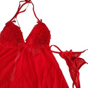 NWT Sexy Leg Ave Ruffle Sheer Mesh Red Lace Wireless Babydoll Lingerie 2pc O/S