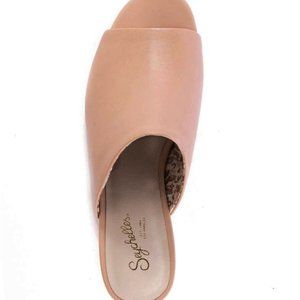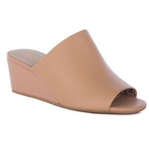 Sleek mid profile wedge slide with nostalgic floral lining. Choose nude or black with a buttery smooth leather wrapped heel.