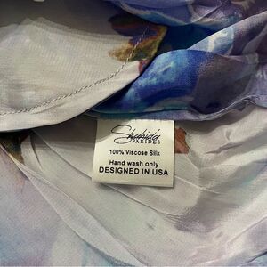 A floral pattern details this woven dress with a ruffle trimmed split neckline and lengthy blouson sleeves. Split neck. Long sleeves. Slips on over head. 100% viscose silk. Hand wash.
