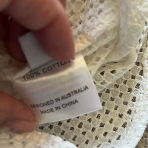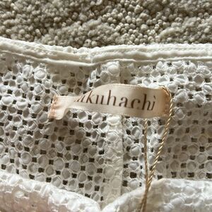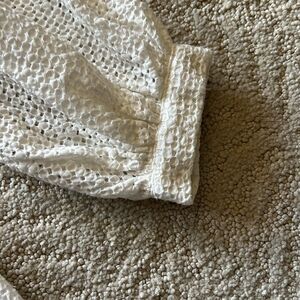 Shakuhachi Lace Dress, also referred to as the Shakuhachi Embroidered Lace Shirt Dress. It is a white, off-the-shoulder dress with long sleeves and a mini-length hem. The dress features a lace or eyelet pattern. It is sheer with no slip. It can be styled casually with shorts and gladiator sandals or swimsuit under.