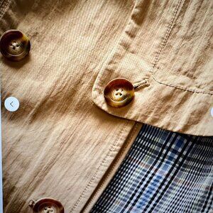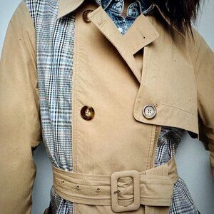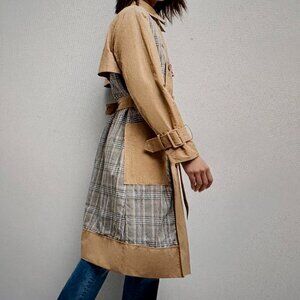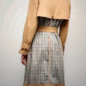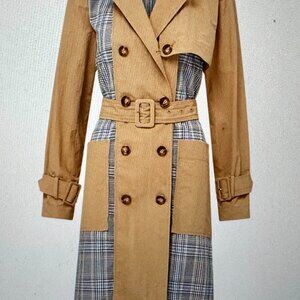 Plaid panels in muted tones accent a camel beige body, giving this midi-length coat a classic yet minimalist appeal.