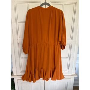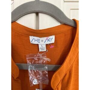 New with tags She + Sky size large orange dress. Buttons half way down and has a drawstring waist that can be tightened. Dolman sleeves. Ruffled hem. 25” from armpit to armpit. 19” across the waist and it is 38” long.
