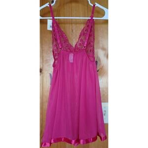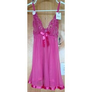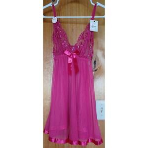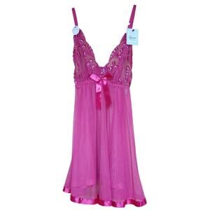 New With Tags Spree Intimates Sheer Fuchsia Chemise With Embroidered Lace and Sequins Ribbon Accents, Baby Doll Style, Women's Medium
