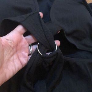 Features silver o ring in the front as detail  With peekaboo front detail. Size extra large has panty protector intact.