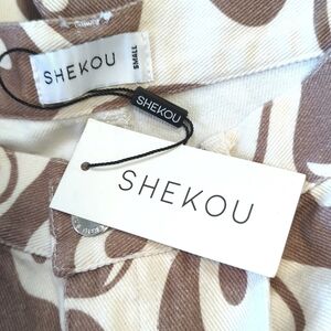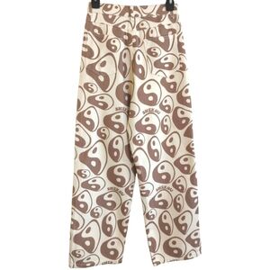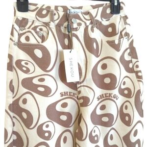 Super cute Ying Yang fabric pattern with Shekou logo printed all over in very hippie style lettering.