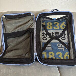 Color: Charcoal Gray with Light Blue Trim and Yellow Zipper Pulls