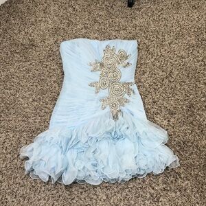 New with tag no flaws. Strapless, sweetheart neckline, padded and boned bodice, sheath silhouette mini dress with ruffle hem. Ruched detailing throughout. Icy blue color with clear rhinestone crystals and beads and silver embroidery. Style 1462