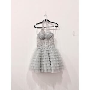 NWT Sherri Hill Halter Ruffle Tulle Cocktail Gown with Leaf Lace Bodice Silver 8
