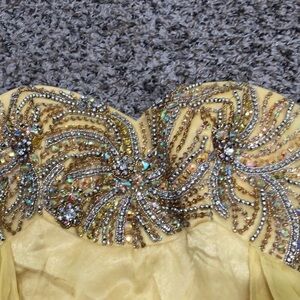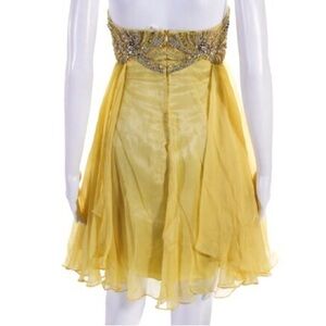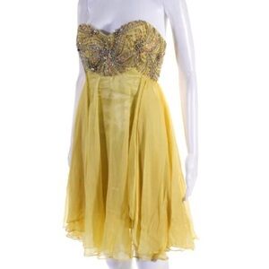 New with tag no flaws. Strapless, sweetheart neckline, padded and boned bodice, empire waist babydoll silhouette mini dress. Zips in back. Canary yellow with aurora borealis crystals.