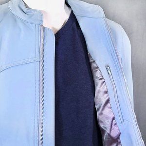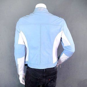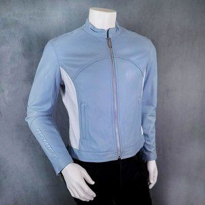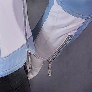 This Women’s Shift Ruble Jacket is a high-end leather street racer style motorcycle jacket featuring soft supple leather in light blue with white accents. The cut and styling are designed to accommodate you when riding. The jacket has a heavy-duty zipper closure with additional zippers on the sleeves and sides to provide a secure fit. A Unique feature is the shift logo embossed on the leather sleeve.