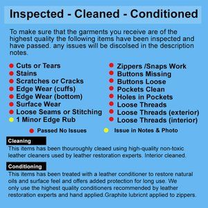 This jacket has been fully inspected (see report in photos) and any issued are listed in photos and descriptions. For all leather items, the items are cleaned with a non-toxic environmentally friendly leather cleaner and a high-quality leather conditioner (one that does not use silicon) is applied to protect the finish of the leather and provide UV protection.