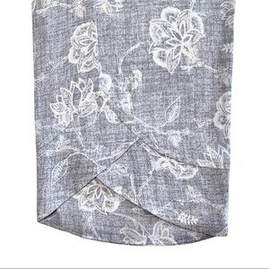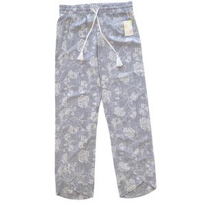 Shimera relaxed crop pants perfect for lounging at home, at the pool, or as pajamas. Reverse printed floral motif & unique tulip hemline. Fabric has nice feel (a bit similar to tennecel) & some stretch; feels cool & would be perfect for warm weather. Has elastic band at waist & draw string with tassels.