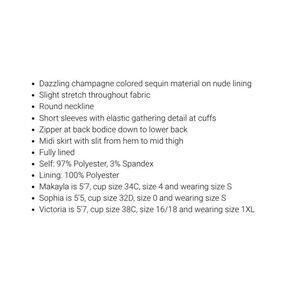 Capture the essence of elegance with our Shimmer Silver Midi Dress, designed to bring a touch of sparkle to any occasion. Adorned with dazzling champagne-hued sequins over a subtle nude lining, this dress offers a sophisticated sheen that catches the light beautifully. Tailored to flatter, its fabric boasts a slight stretch, ensuring comfort without compromising on style.