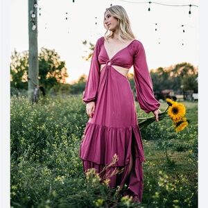 This elegant pink sundress features a smocked bodice and a daring plunge neckline, making it perfect for a wedding guest or a night out. The long bishop sleeves add a touch of sophistication, while the cut-out detail at the waist enhances its chic appeal. Ideal for any occasion, this dress combines style and comfort effortlessly.